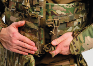 Quick-release fasteners on the front panel allow rapid replacement of pouches.